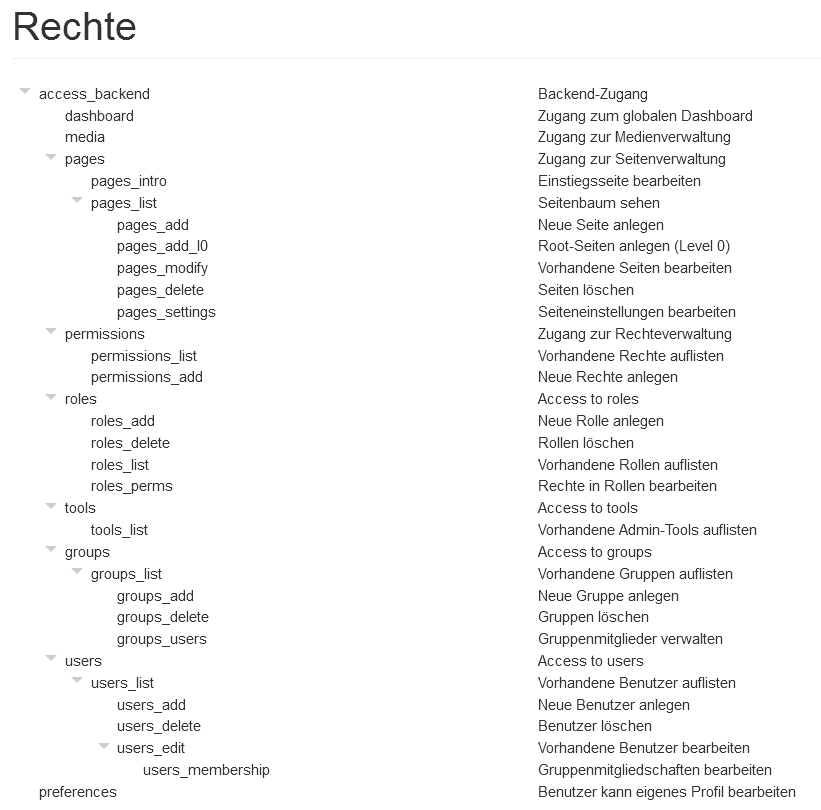 Im BackStrap Admin Theme wird per JavaScript dafür gesorgt, dass bei der Auswahl eines untergeordneten Rechts automatisch auch alle vorausgesetzten Rechte angehakt werden. In anderen Admin Themes kann das auch anders aussehen. Beim Speichern der Konfiguration wird daher auch auf der Serverseite noch einmal kontrolliert, ob die vorausgesetzten Rechte vorhanden sind.